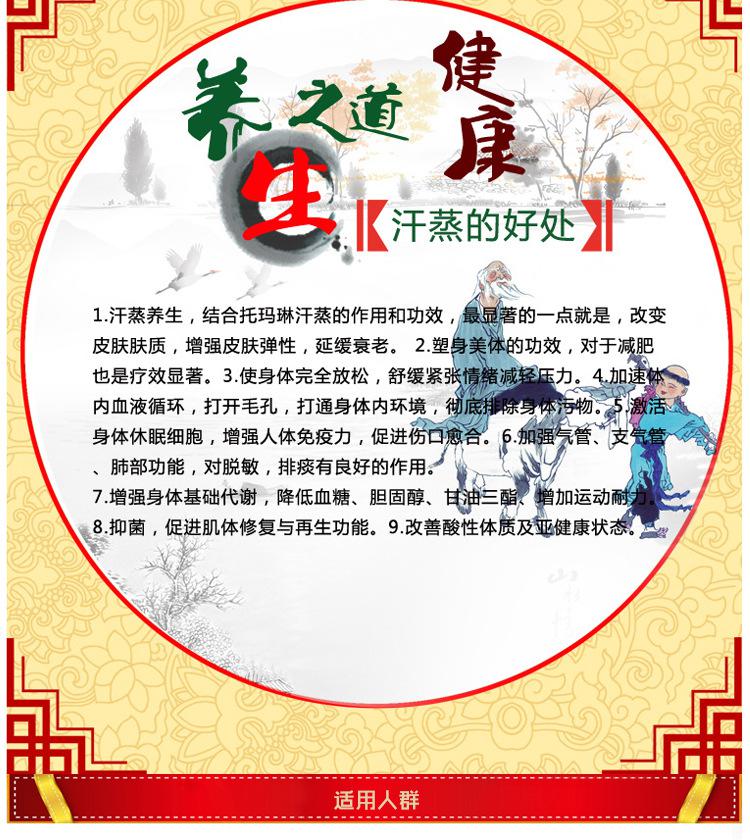 汗蒸房中的電氣石受熱后發(fā)出的遠(yuǎn)紅外線可以滲透到人體的深處,作用于人體骨骼附近的韌帶及肌肉組織,使血管擴(kuò)張,疏通經(jīng)絡(luò),有利用血液循環(huán)和新陳代謝。其作用原理是將人體內(nèi)水分小分子化從而增加人體內(nèi)水分的滲透能力和溶解能力加速身體勞損患處乳酸代謝、增加細(xì)胞活力減少和改變細(xì)胞的病變。 這也是汗蒸過程中蒸一次就能緩解腰酸背痛癥狀的原因。