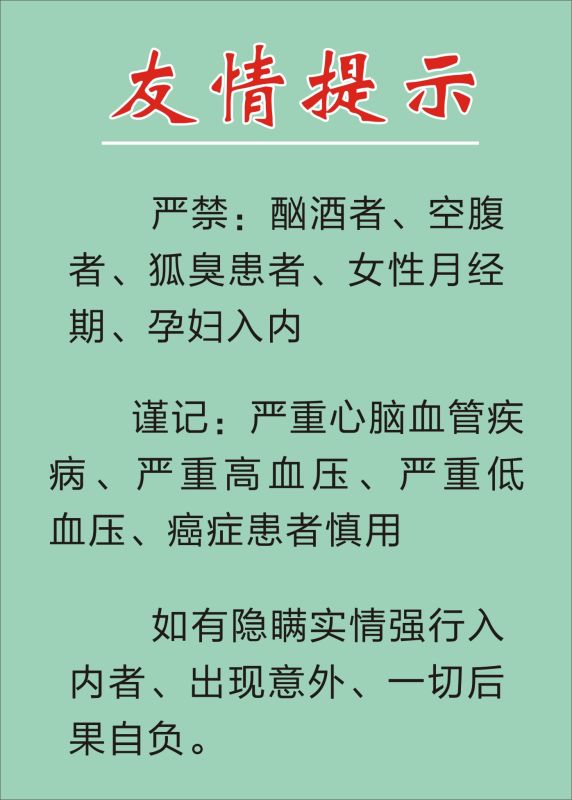 3、嚴(yán)禁孕婦、酗酒者、空腹者、嚴(yán)**腦血管疾病、嚴(yán)重高血壓、嚴(yán)重低血壓、女性月經(jīng)期、有出血癥狀、不適合高溫環(huán)境者入內(nèi)。老人或未成年人必須有家屬陪同方可入內(nèi)汗蒸,否則禁止入內(nèi)。